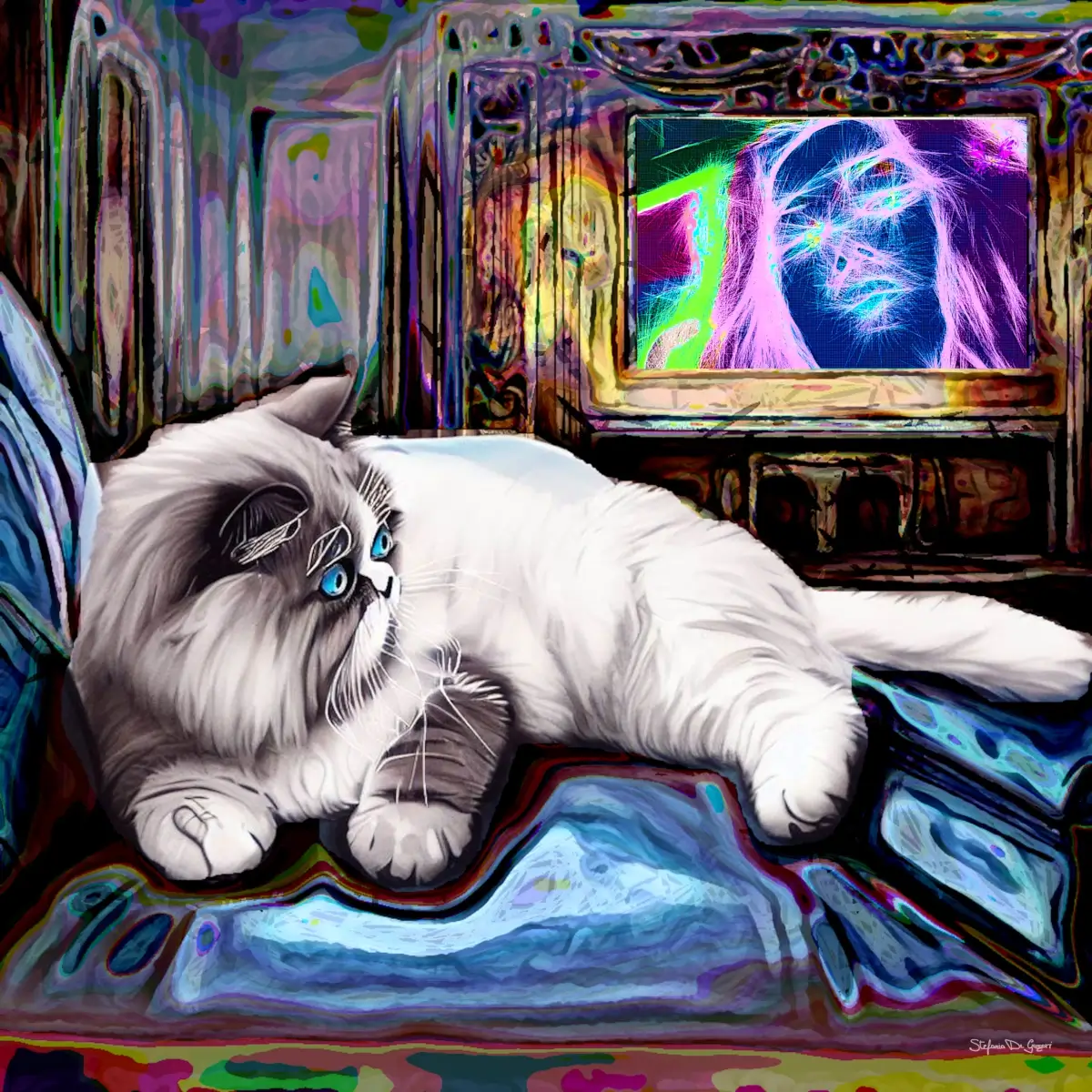 Throughout history, cats have represented guardianship, spiritual vision, and independence. In this digital composition, the feline becomes a mirror of the unseen, encouraging the observer to look deeper. Layers of symbolic detail create a narrative where purity and hidden wisdom meet, adding depth to the overall experience.